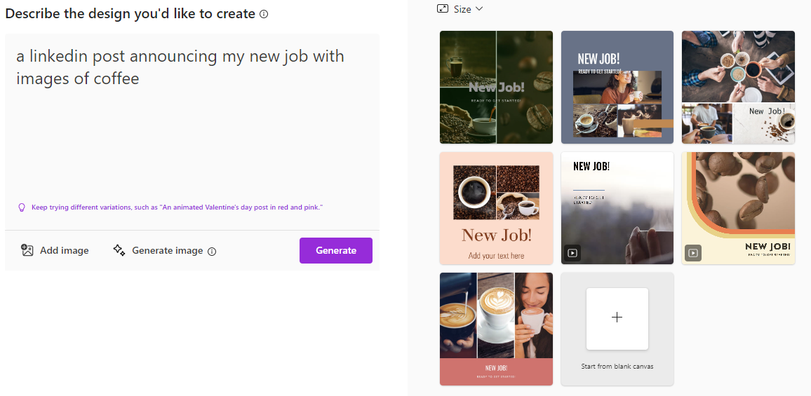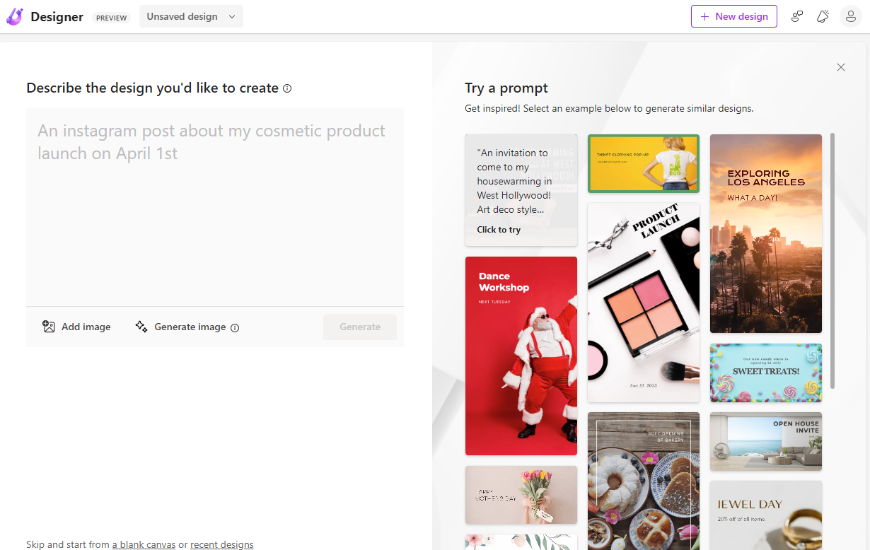 그림 생성 AI를 통해 세상에 없는 이미지를 만든 후 그 이미지를 포함하여 디자인을 제안받을 수도 있다.(Generate image)