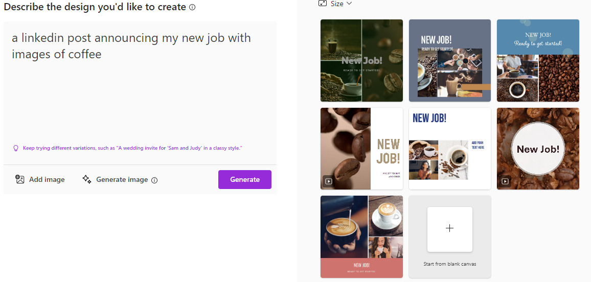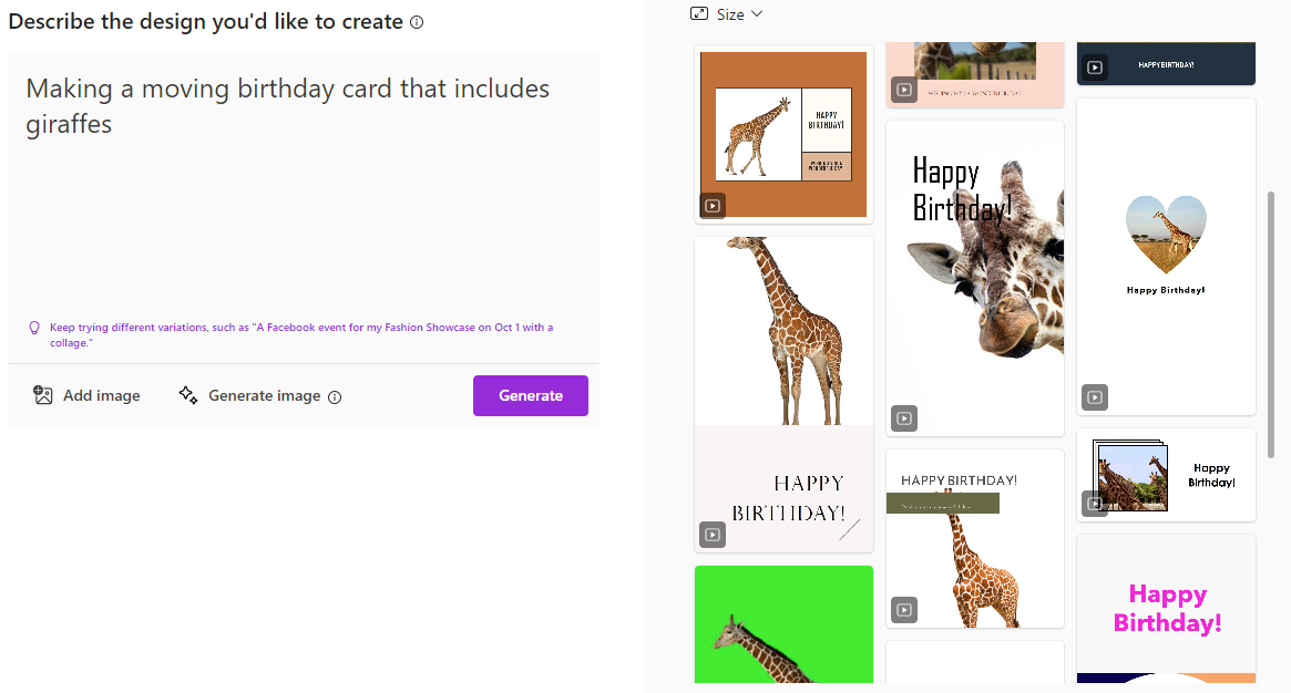 Describe 창에 내가 원하는 디자인 문구를 작성하면 이제 AI 디자이너가 나에게 여러 디자인을 제안해 준다.