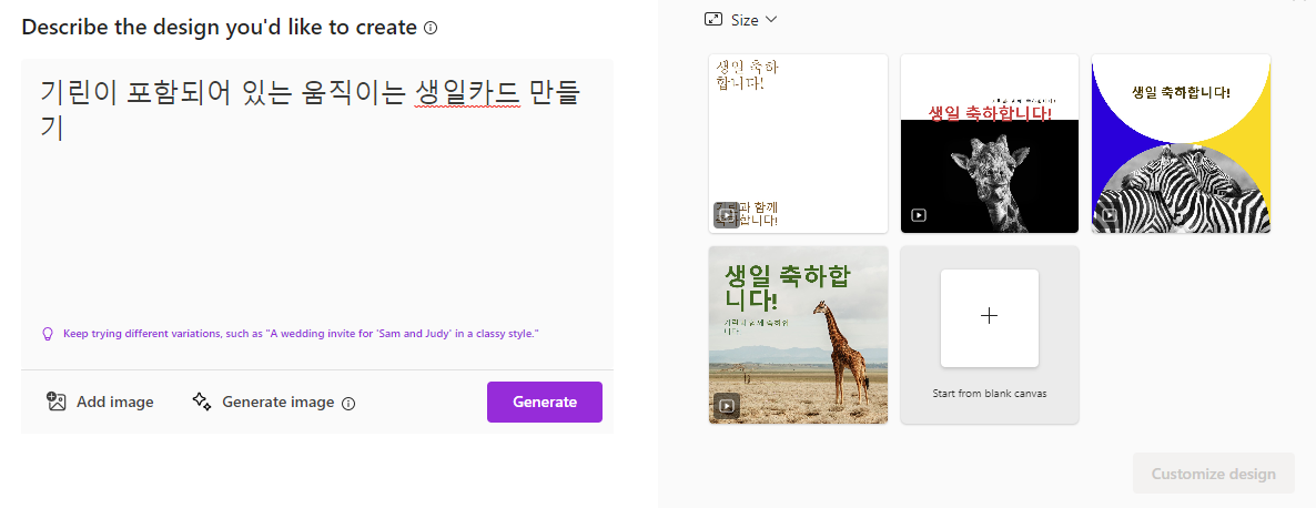 이렇게 생성된 디자인 중 원하는 걸 선택한 뒤 하단의 Customize design을 누르면 이미지를 편집할 수 있는 화면으로 연결된다.
