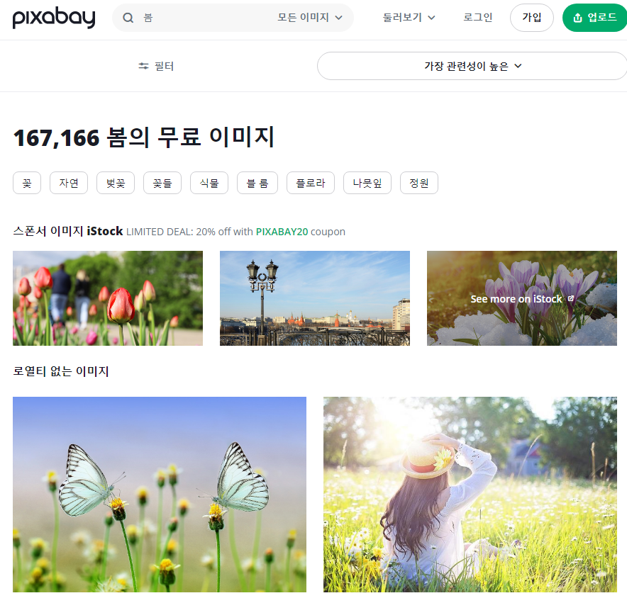 너무나 유명한 사이트 픽사베이. 이 곳도 픽셀처럼 개인용/상업용으로 이미지 사용이 가능하다. 하지만 모두 무료는 아니기 때문에 저작권여부는 항상 민감하게 체크해야 한다. 회원가입 없이 사용이 가능하다. 픽사베이도 외국 사이트이기 때문에 영어로 검색하는 게 더 많은 자료를 얻을 수 있지만, 한국어도 지원하고 있다. 단, 영어와 한국어 검색 시 나오는 자료가 다르기 때문에 둘 다 검색해 보는 걸 추천한다.